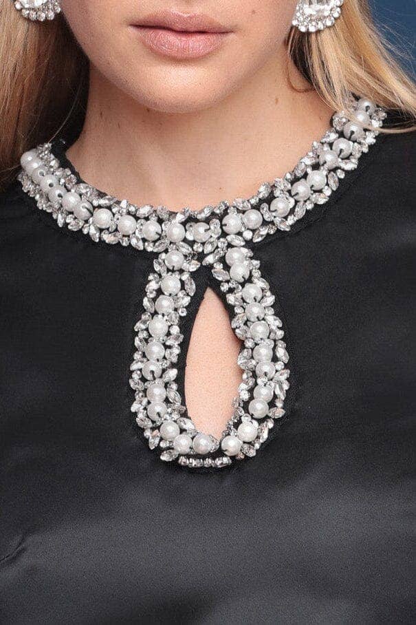 Sleek and striking, this black shift dress is defined by its dazzling rhinestone and pearl trim that frames the neck and hemline. Crafted in smooth satin with a subtle sheen, the sleeveless silhouette is elevated by a keyhole cutout and body-skimming fit. From cocktail hours to rooftop parties, this head-turning piece brings modern glamour to every occasion.