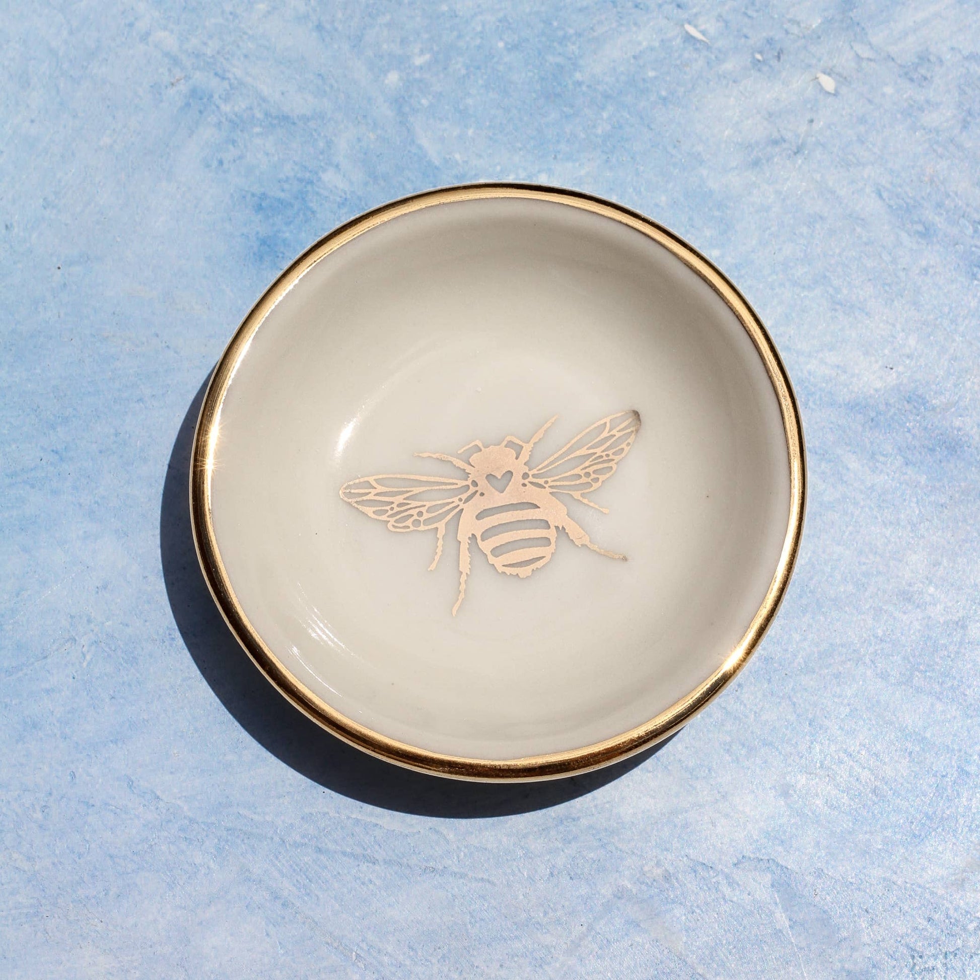 Each trinket dish is unique and feature a white glossy glaze, adorned with a delicate 22k gold bee with a center heart silhouette.