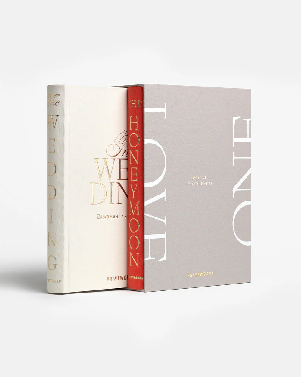 This elegant photo book set is designed to preserve the memories of your wedding day and honeymoon in one beautifully curated slipcase.