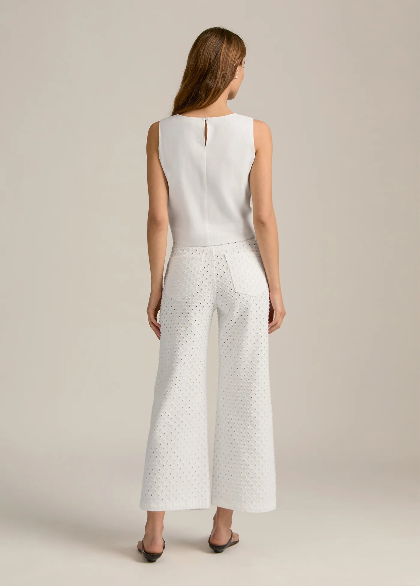 The Masha is a cropped 26.5" length, five-pocket style with frayed eyelet details for a perfectly undone feel. Made from rigid white denim, these jeans sit high on the waist with an 11.75" rise and are fitted through the hips for a flattering silhouette. Pair with The Micha Shirt for a monochromatic denim-on-denim set.