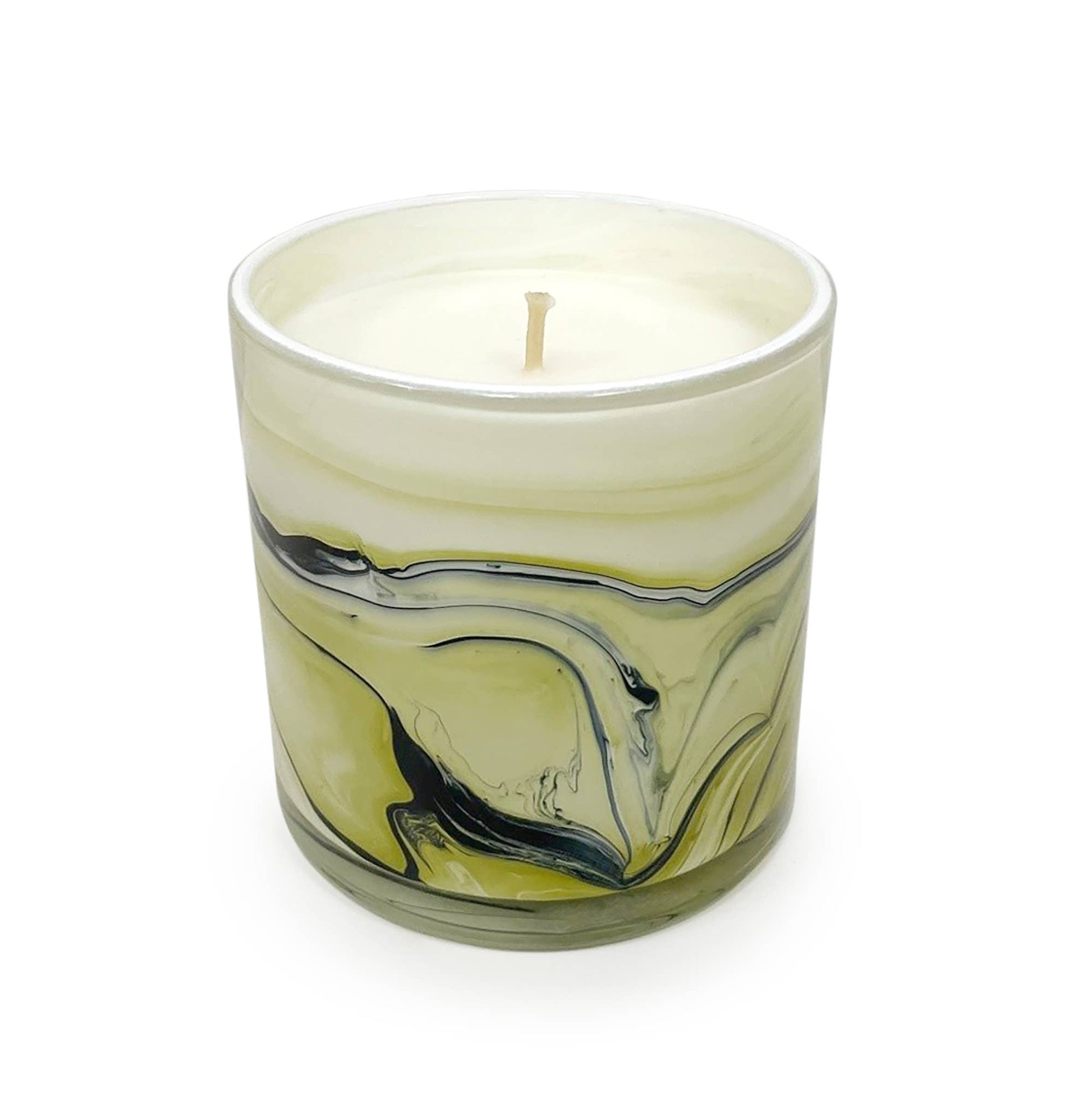 Beautiful fragrance notes of fresh vetiver and smooth oak fill this gorgeous glass candle cup designed to have an organic and flowing color pattern.